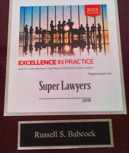 Russell Babcock has been voted a SuperLawyer for 2015 for his outstanding defense in federal and state criminal cases. Only 5% of attorneys qualify for SuperLawyers. While Russell has won many awards for his outstanding San Diego crminal defense work, he especially pleased with this award because it requires an independent nomination, a confirmation by his peers, and his being voted in by a special committee. “The practice of law is like being a surgeon,” Russell says. Not only is academic background important, but also skills that are honed over more than three decades of work.